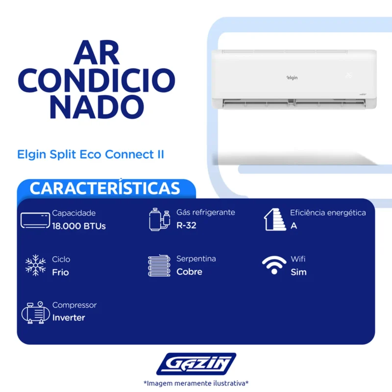 Em até 1x de R$1.973,40 sem jurosEm até 12x de R$186,60 com juros À vistaR$1.776,06no PixAr Condicionado 18.000 BTUs Eco Inverter II Connect Elgin Frio – 220 Volts