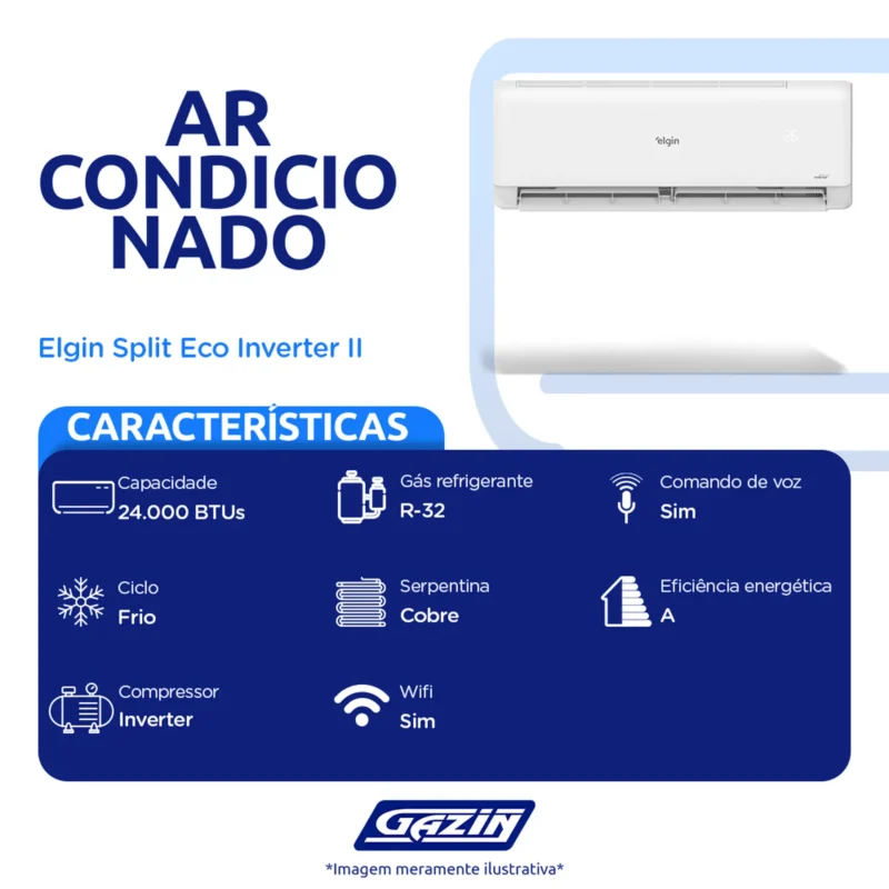 Em até 1x de R$3.129,75 sem jurosEm até 12x de R$295,95 com juros À vistaR$2.816,78no PixAr Condicionado 24.000 BTUs Eco Inverter II WIFI Elgin Frio