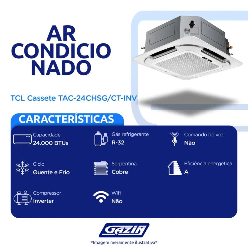 Em até 1x de R$1.769,95 sem jurosEm até 12x de R$167,37 com juros À vistaR$1.592,96no PixAr Condicionado Cassete 24.000 BTUs Inverter TAC-24CHSG/CT-INV TCL Quente e Frio