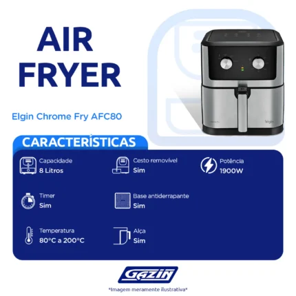 Em até 1x de R$302,90 sem jurosEm até 12x de R$28,64 com juros À vistaR$272,61no PixFritadeira Elétrica Air Fryer Chrome Fry Elgin AFC80 8L 1900W – Preto/Inox – 110 Volts