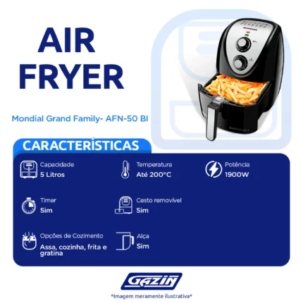 Em até 1x de R$227,18 sem jurosEm até 12x de R$21,48 com juros À vistaR$204,46no PixFritadeira Elétrica Air Fryer Mondial Grand Family AFN-50 BI 5L 1900W Timer – Preto/Inox – 110 Volts