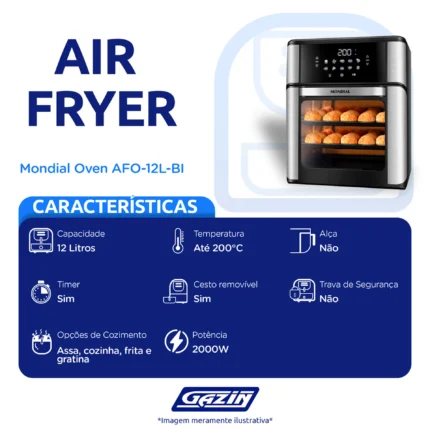 Em até 1x de R$514,15 sem jurosEm até 12x de R$48,62 com juros À vistaR$462,74no PixFritadeira Elétrica Air Fryer Mondial Oven AFON-12L-BI 12L 2000W – Preto/Inox – 220 Volts