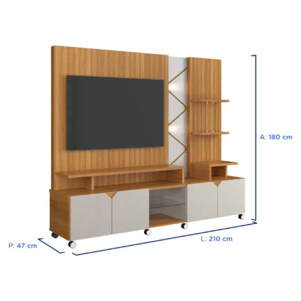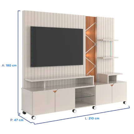 Estante Home para TV até 55″ com LED Cross Lukaliam Rodízios Cromados – Off White Perolizado/ Jequitibá