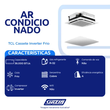 Em até 1x de R$3.991,00 sem jurosEm até 12x de R$377,39 com juros À vistaR$3.591,90no PixAr-Condicionado Split Cassete Inverter 36.000 BTUs TCL Frio – 220 Volts