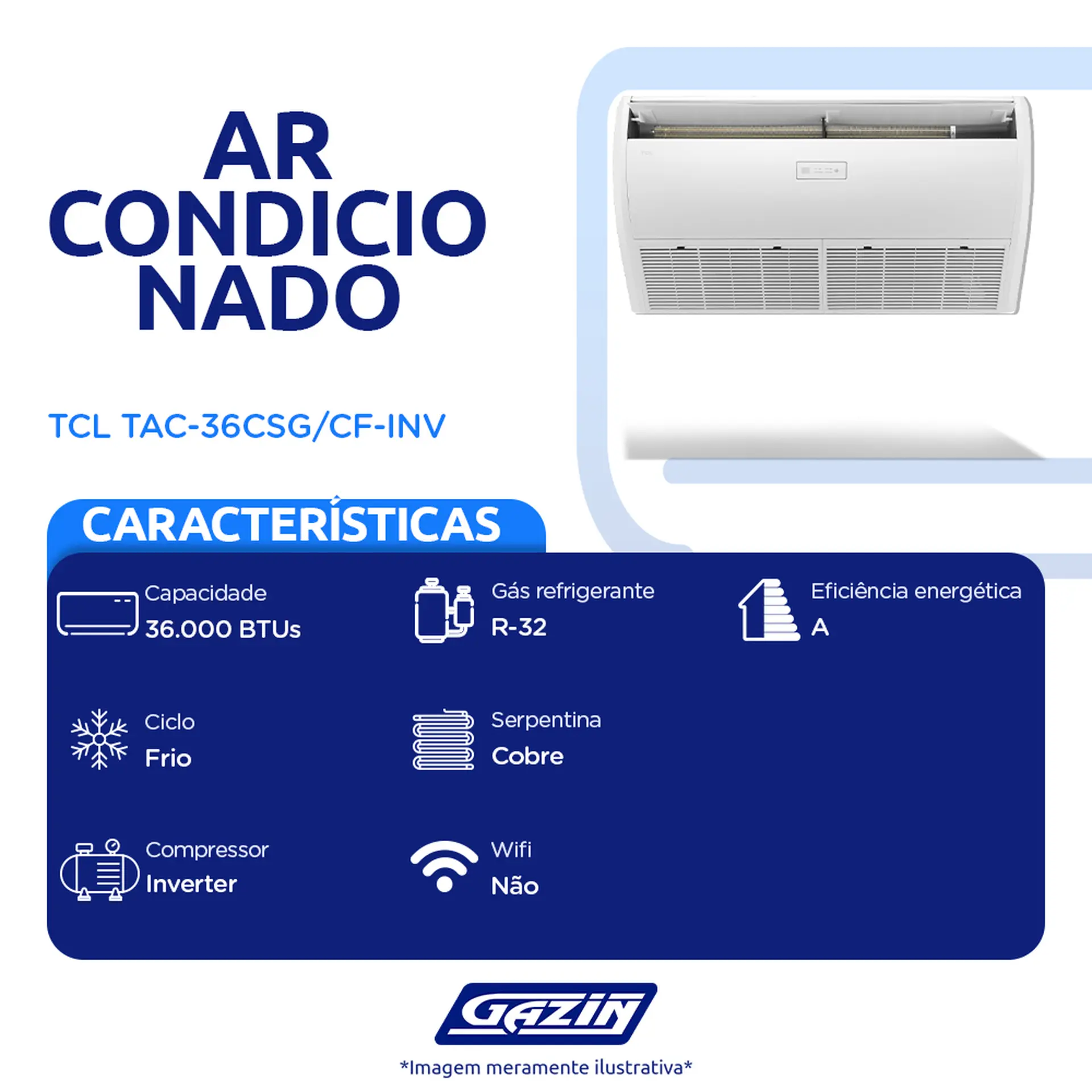 Com o Ar Condicionado Piso Teto TAC-36CSG/CF-INV, você terá o conforto e qualidade que merece! São 36.000 BTUs de capacidade e diversas funções para você aproveitar à vontade no calor. Confira mais detalhes: Qualidade de vida!Para te proporcionar uma qualidade de vida melhor com um ar mais puro e saudável, o aparelho conta com as funções anti-mofo e anti-bactérias. Essas funções previnem o crescimento de fungos e mofo dentro do equipamento e no ar que circula, além de reduzir o risco de infecções respiratórias e ainda contribuir para um ambiente muito mais saudável.Economia!Com a tecnologia Inverter e eficiência energética A, o ar-condicionado te proporciona diversas vantagens! Você conta com uma temperatura estável, conforto e também muita economia de energia. Sem contar também que o aparelho proporciona uma operação muito mais eficiente e uma qualidade de vida sensacional.Sobre a marca: qualidade TCL!A Semp TCL está há 77 anos no mercado, sendo uma empresa que vem revolucionando a trajetória da tecnologia brasileira, uma das maiores fabricantes de TV e a primeira a fabricar aparelhos televisores no Brasil. Hoje é líder global em Android TV. A junção da SEMP e TCL é o melhor de dois mundos, inovando para você. Além disso, a SEMP se preocupa com o esporte brasileiro, patrocinando a seleção masculina e feminina de futebol e o comitê paralímpico brasileiro, apoiando esses atletas que inspiram o Brasil por meio do esporte.