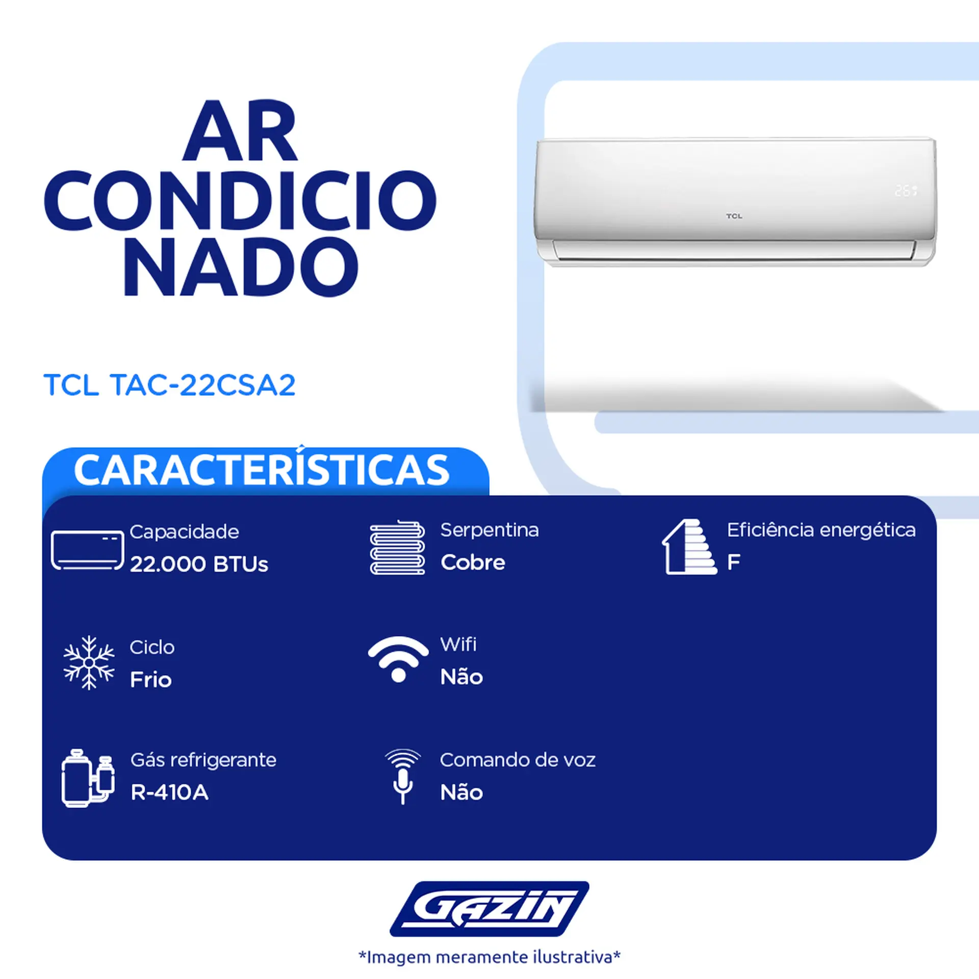 Quando o calor intenso invade seu ambiente e torna o conforto uma memória distante, um ar-condicionado eficiente e poderoso se torna essencial para restaurar a tranquilidade. O Ar-Condicionado TCL TAC-22CSA2 22.000 BTUs oferece desempenho de alto nível para quem valoriza conforto e eficiência, proporcionando uma experiência refrescante e agradável, mesmo nos dias mais quentes. Confira mais detalhes: Potência e desempenho confiáveisCom uma capacidade térmica de 6.446 W, este modelo conta com tecnologia On/Off e um compressor rotativo que garante uma refrigeração potente e contínua. Diferente da tecnologia Inverter, o sistema On/Off trabalha ligando e desligando o compressor para manter a temperatura ajustada. Assim que a temperatura desejada é atingida, o compressor desliga e volta a ligar quando o ambiente aquece novamente.Economia e silêncioA classificação energética F destaca um consumo anual de 1.776 kWh, ideal para quem busca controle do consumo energético sem comprometer o desempenho. Além disso, o conforto térmico é complementado pela operação silenciosa, com níveis de ruído que variam de apenas 37 dB(A) no modo silencioso até 50 dB(A) em alta potência. A condensadora opera a 56 dB(A), tornando o aparelho discreto e eficiente.Sobre a marca: A Semp TCL está há 77 anos no mercado, sendo uma empresa que vem revolucionando a trajetória da tecnologia brasileira, uma das maiores fabricantes de TV e a primeira a fabricar aparelhos televisores no Brasil. Hoje é líder global em Android TV. A junção da SEMP e TCL é o melhor de dois mundos, inovando para você. Além disso, a SEMP se preocupa com o esporte brasileiro, patrocinando a seleção masculina e feminina de futebol e o comitê paralímpico brasileiro, apoiando esses atletas que inspiram o Brasil por meio do esporte.