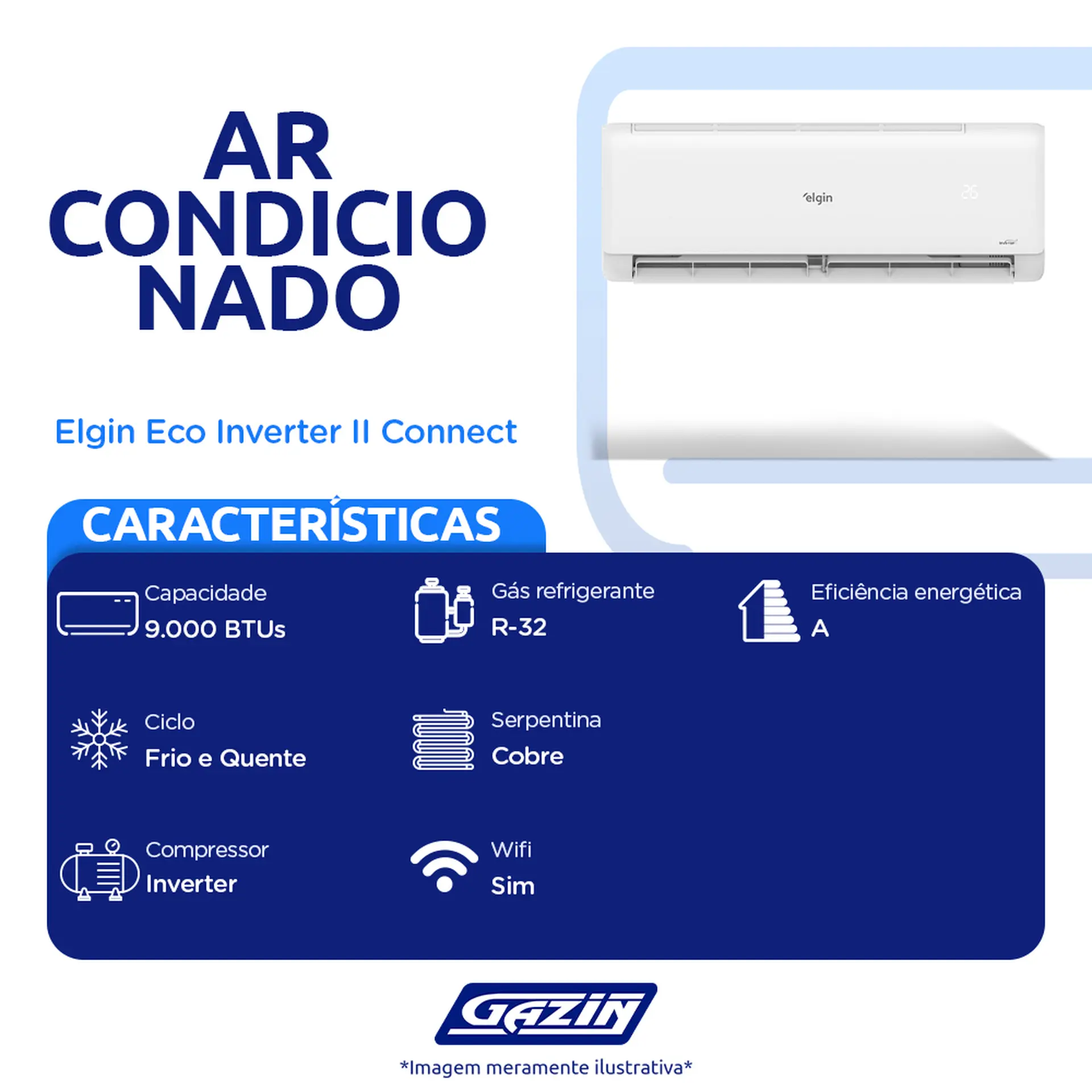O Ar Condicionado Elgin Eco Inverter II Connect com 9.000 BTUs de capacidade e ciclo Quente e Frio é uma solução completa para quem busca conforto, eficiência energética e sustentabilidade o ano inteiro. Com tecnologia Inverter, o modelo ajusta automaticamente a velocidade do compressor, o que resulta em um funcionamento mais eficiente e econômico, proporcionando uma climatização precisa e estável sem grandes variações de temperatura. A classificação A no Inmetro e o selo Procel destacam a alta performance energética, permitindo que você economize energia sem abrir mão de um ambiente sempre agradável.Cuidado ambientalO sistema de refrigeração utiliza o gás ecológico R32, uma escolha que reflete o compromisso com a preservação ambiental. Ele tem um impacto muito menor sobre a camada de ozônio e apresenta um potencial de aquecimento global reduzido a um terço, oferecendo uma alternativa mais sustentável para os consumidores que buscam soluções que minimizem os impactos ambientais.FiltragemAlém de sua eficiência energética e sustentabilidade, o Elgin Eco Inverter II Connect se destaca pelo cuidado com a qualidade do ar. Já que possui um sistema de filtragem avançado que inclui um filtro de alta capacidade de fácil remoção para limpeza, um filtro de íons de prata e um filtro ionizador ativo. Juntos, esses filtros ajudam a eliminar bactérias, vírus, ácaros e fungos, mantendo o ar mais puro e saudável, ideal para ambientes onde a qualidade do ar é essencial.ConectividadeA conexão Wi-Fi proporciona o controle do ar-condicionado de qualquer lugar, por meio do aplicativo AC Elgin Air. Isso proporciona um nível de conveniência adicional, pois é possível ajustar a temperatura, ligar ou desligar o aparelho à distância, sem sair do lugar. Além disso, o sistema é compatível com assistentes de voz, como a Alexa e o Google Assistente, facilitando ainda mais o controle por comandos de voz.PraticidadeO design da unidade interna também foi projetado para garantir praticidade e conforto. A unidade possui um display invisível que indica a temperatura e acende automaticamente ao ligar o aparelho. Para maior conforto durante a noite ou quando preferir não ver a luz, o display pode ser desligado facilmente através da tecla “visor”. O controle remoto sem fio é moderno, iluminado e possui um visor de fácil leitura, mesmo em ambientes com pouca luminosidade, o que torna o uso ainda mais confortável.Sobre a marca: qualidade Elgin