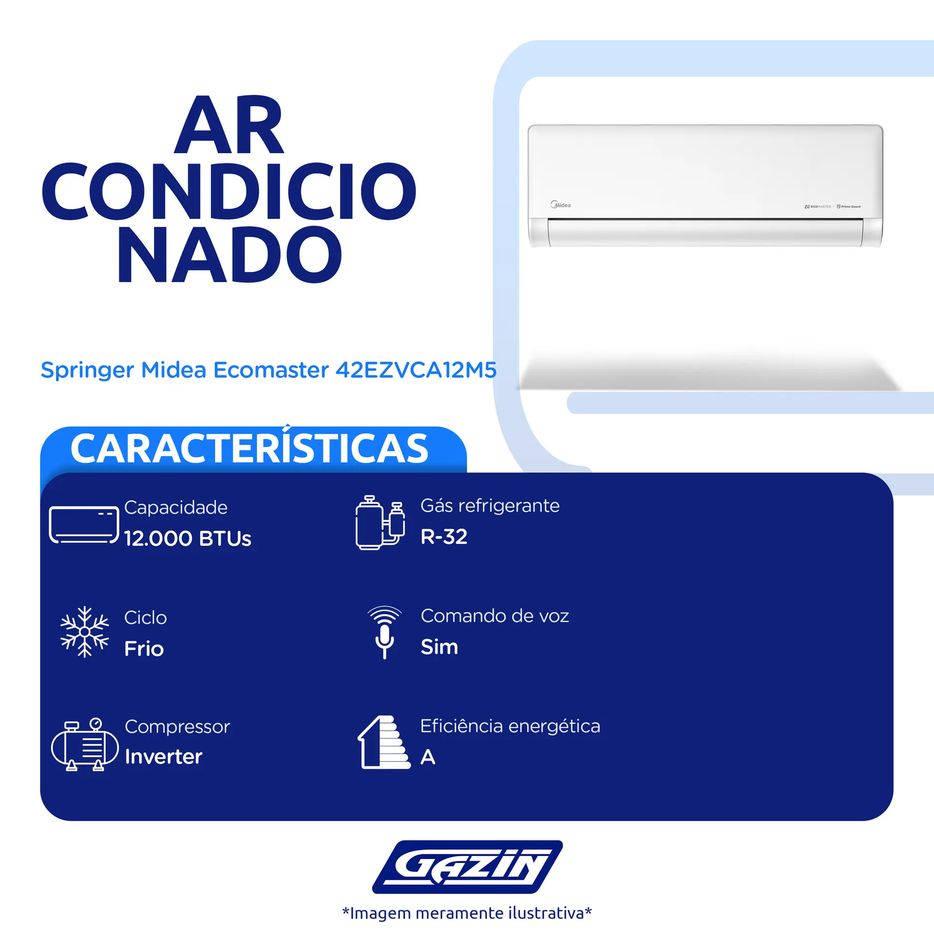Ar-Condicionado Split Inverter 12.000 BTUs Al Ecomaster Springer Midea Frio Se você está em busca de conforto térmico com tecnologia de ponta e economia de energia, o é a escolha ideal. Desenvolvido com inteligência artificial e recursos modernos, esse modelo proporciona um ambiente mais agradável, silencioso e saudável para você e sua família. Com design discreto e funcionalidades inteligentes, ele se adapta perfeitamente a diferentes estilos de vida e necessidades. Confira mais detalhes: Tecnologia Inverter e Inteligência Artificial Al Ecomaster!Com capacidade de 12.000 BTUs e compressor Inverter, este ar-condicionado oferece alta performance com consumo reduzido de energia. A tecnologia Inverter ajusta o funcionamento do compressor conforme a necessidade, evitando picos de energia e mantendo a temperatura estável. Além disso, o recurso Al Ecomaster, com inteligência artificial, garante ainda mais eficiência e conforto ao adaptar automaticamente o funcionamento do aparelho à temperatura do ambiente, resultando em clima sempre agradável com máxima economia.Funções que trazem conforto e praticidade!O Midea Al Ecomaster é equipado com comando de voz compatível com Alexa, Google Assistant e Apple Siri, permitindo que você controle seu ar-condicionado com facilidade e sem precisar se levantar. Conta também com a função LED, que desativa o sinal sonoro e apaga a luz do display da unidade interna, ideal para garantir noites de sono mais tranquilas e sem incômodos. Essas funções foram pensadas para trazer praticidade ao seu dia a dia e proporcionar um ambiente ainda mais confortável.Saúde e durabilidade garantidas!Pensando no bem-estar dos usuários, esse modelo possui uma função de autolimpeza com 4 etapas que mantém a unidade interna livre de poeira, sujeiras e mofo, garantindo um ar mais puro e saudável. Além disso, o ar-condicionado conta com proteção anticorrosão, aumentando sua durabilidade e resistência em ambientes mais úmidos ou sujeitos a maresia. O gás refrigerante R32 é mais eficiente e menos agressivo ao meio ambiente, reforçando o compromisso da marca com a sustentabilidade.Sobre a marca: qualidade Springer Midea!Uma empresa visionária e pioneira. Assim é a Springer, fundada em Porto Alegre em 1934, sempre aliando tecnologia e modernidade para levar os melhores produtos para os lares brasileiros. O primeiro ar-condicionado da América Latina foi lançado por ela, que hoje produz uma linha completa de condicionadores de ar e produtos climáticos de altíssima qualidade pelo melhor custo-benefício do mercado. Em seu portfólio se encontram modelos Split High Wall, Janela, Piso-teto, Umidificadores, Máquinas de Gelo e Portáteis. Pensando no total conforto da população brasileira, a Springer se uniu à gigante mundial de eletrodomésticos Midea para oferecer simplesmente o melhor em produtos para climatização e purificação de água.