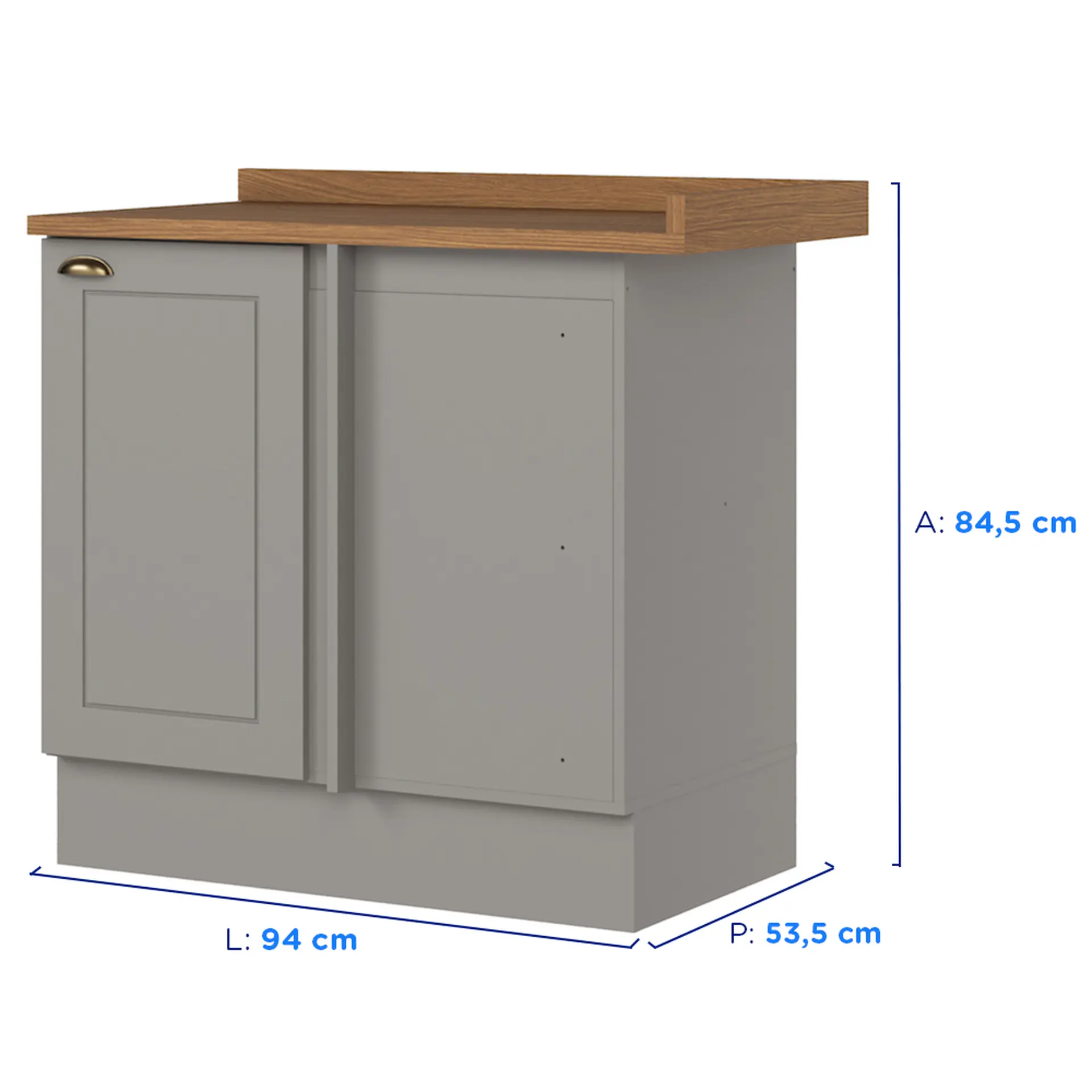 A construção do balcão foi pensada para oferecer durabilidade e estabilidade. A caixa do móvel combina a robustez do MDF BP de 25mm com a firmeza do MDF de 15mm. As partes internas e a frente da porta também são feitas em MDF de 15mm, garantindo uma estrutura coesa. O fundo é finalizado com uma chapa de MDF de 3mm. Para a funcionalidade do dia a dia, o balcão conta com dobradiças e um puxador, ambos fabricados em metal, materiais que asseguram resistência ao uso contínuo.