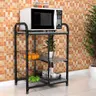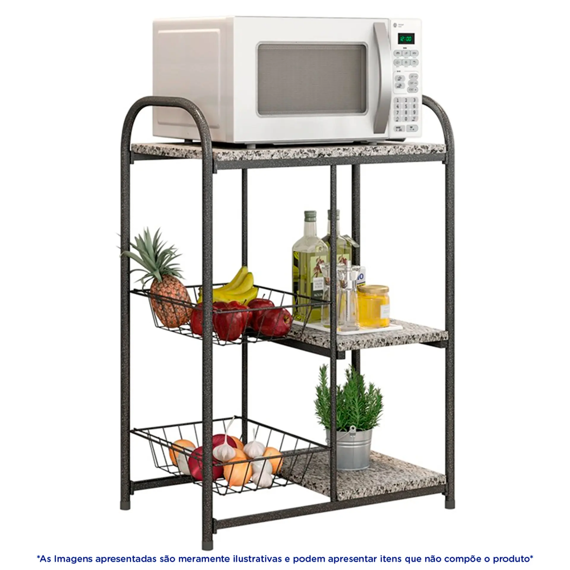 Com 1 tampo em granito, ideal para acomodar fornos ou micro-ondas, 2 prateleiras em granito e 2 cestas para frutas, que são removíveis, facilitando na hora da limpeza. Além disso, é produzido em aço-carbono, com tampos em granito. É o produto curinga, que não pode faltar em sua casa.