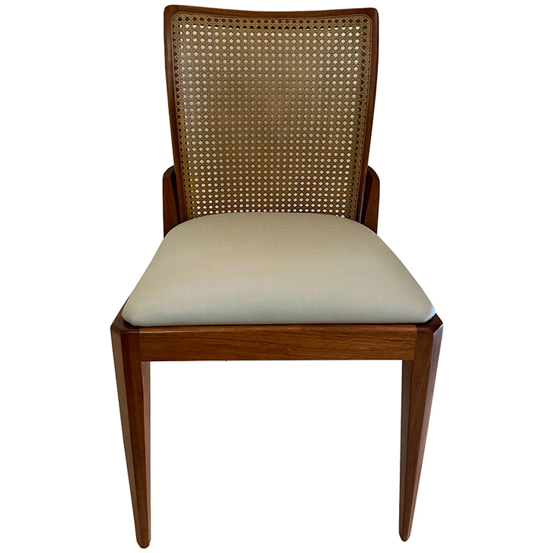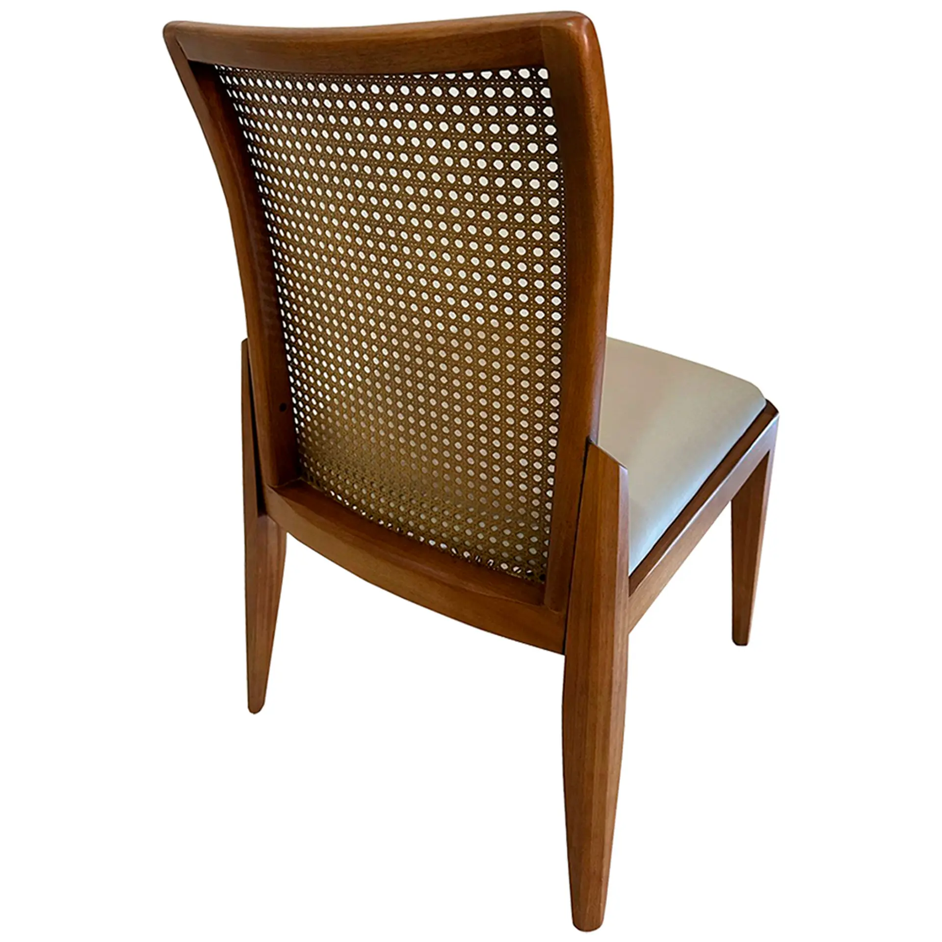 A combinação entre a madeira de jequitibá e a tela sextavada confere ao modelo uma presença leve, porém marcante. A ergonomia do encosto favorece uma postura agradável e acolhedora, ideal para longos momentos à mesa ou em espaços de convivência.