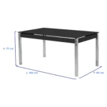 com um confortável tecido. Já a mesa possui uma estrutura de aço cromado e um tampo de vidro temperado, com um acabamento em