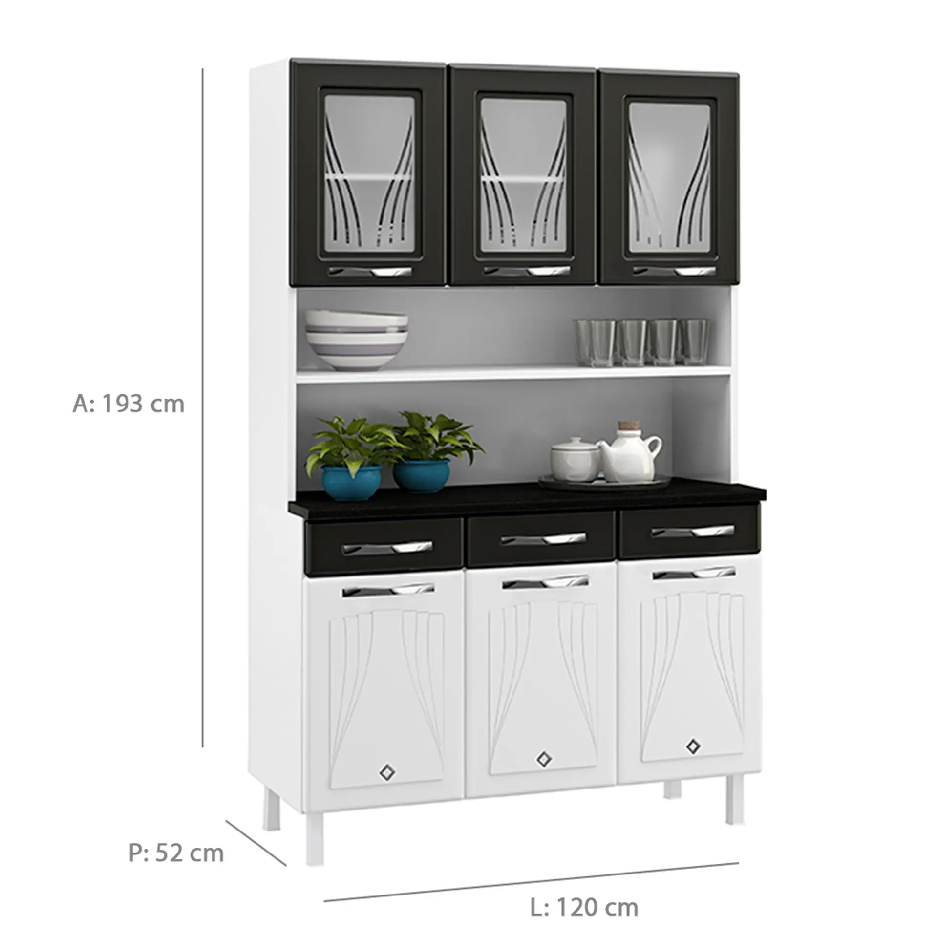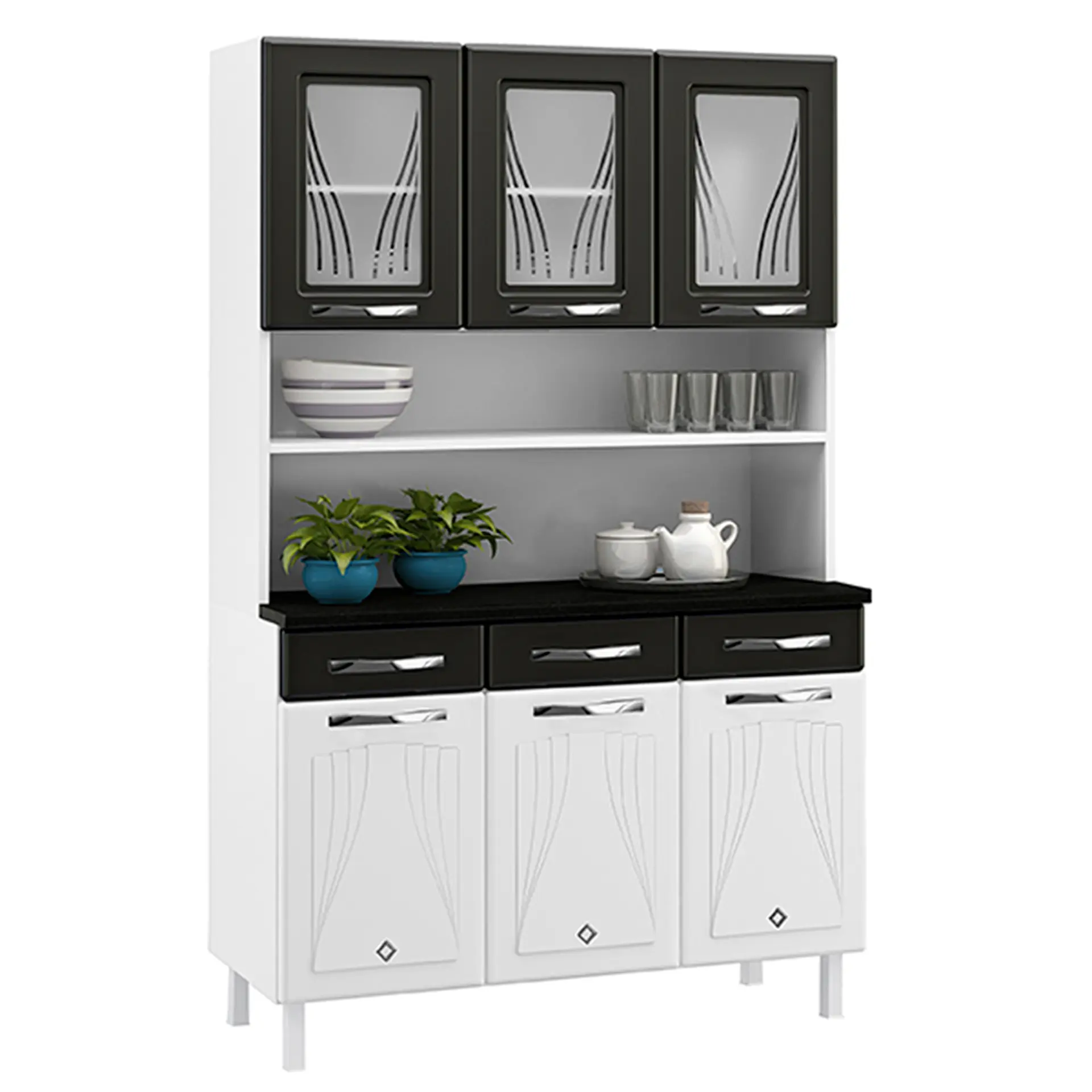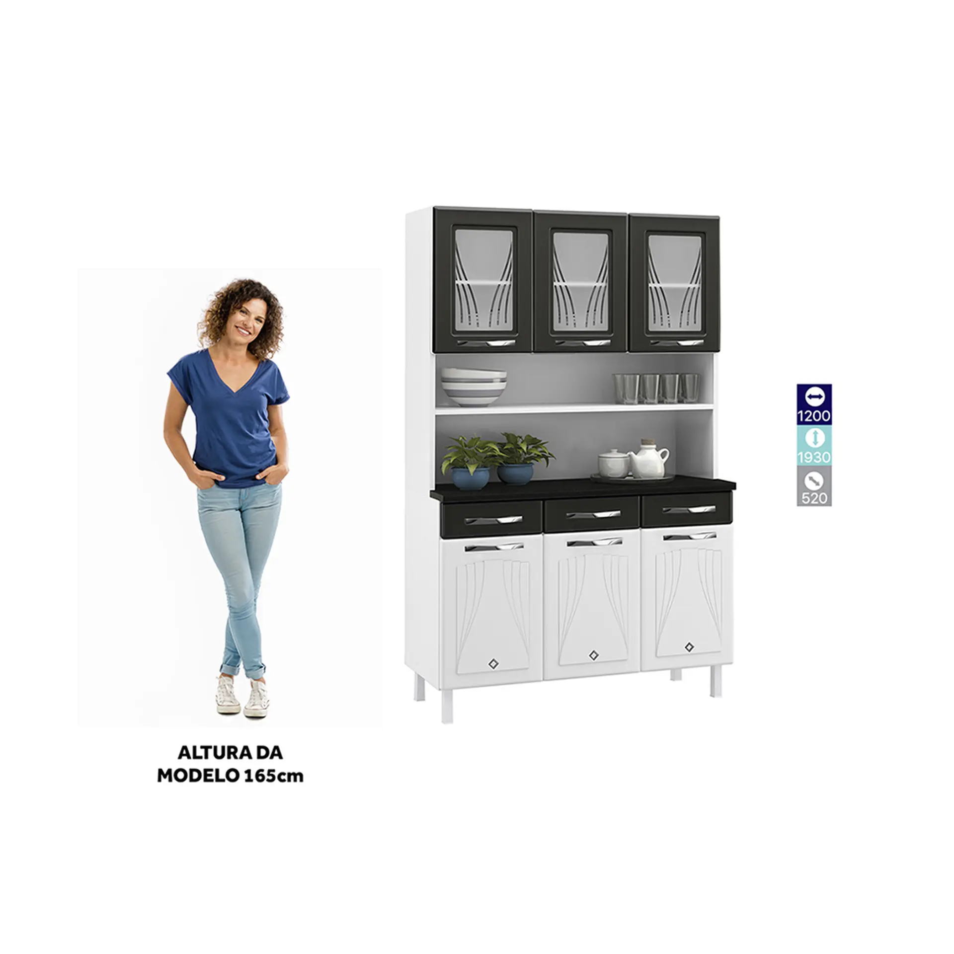 Possui 6 portas, sendo que três delas trazem detalhes em vidro temperado serigrafados, que dão um verdadeiro charme. Seus puxadores são de acrílico e seus pés são reguláveis, se adaptando a qualquer tipo de piso.
