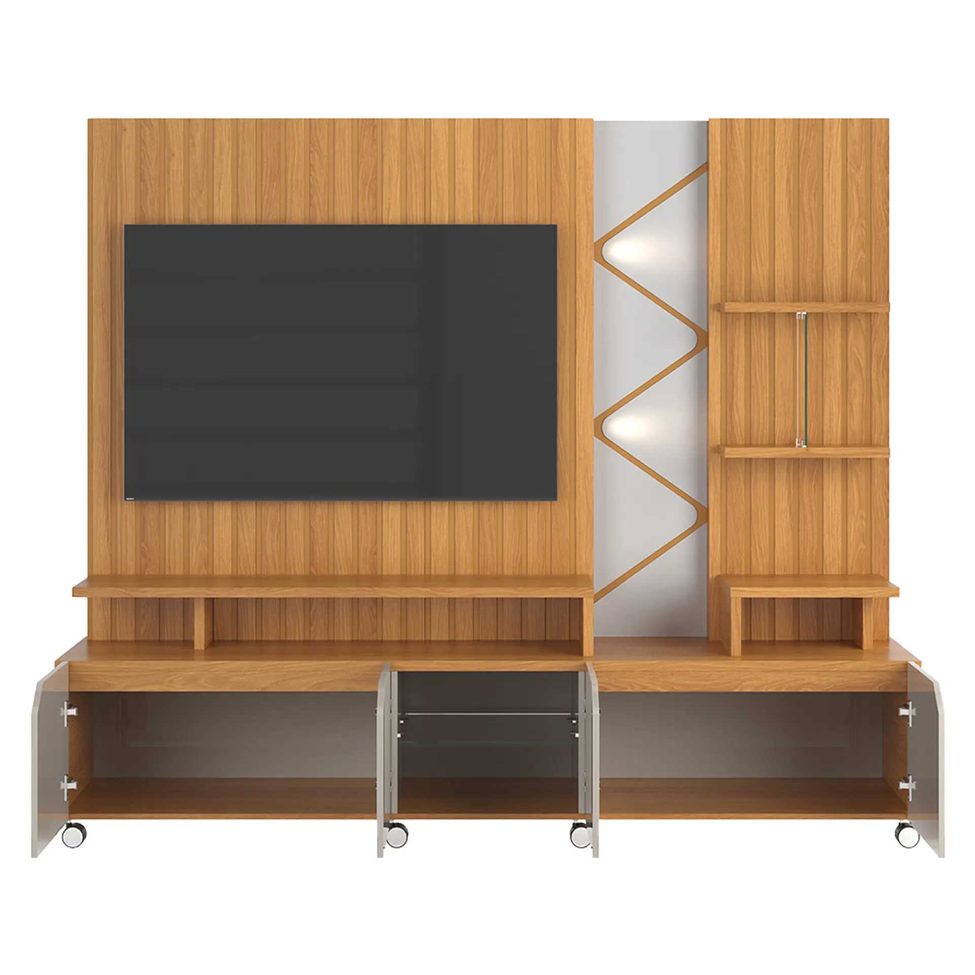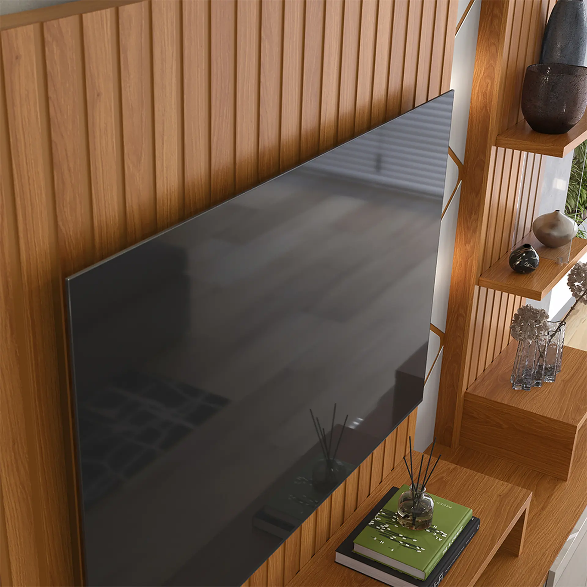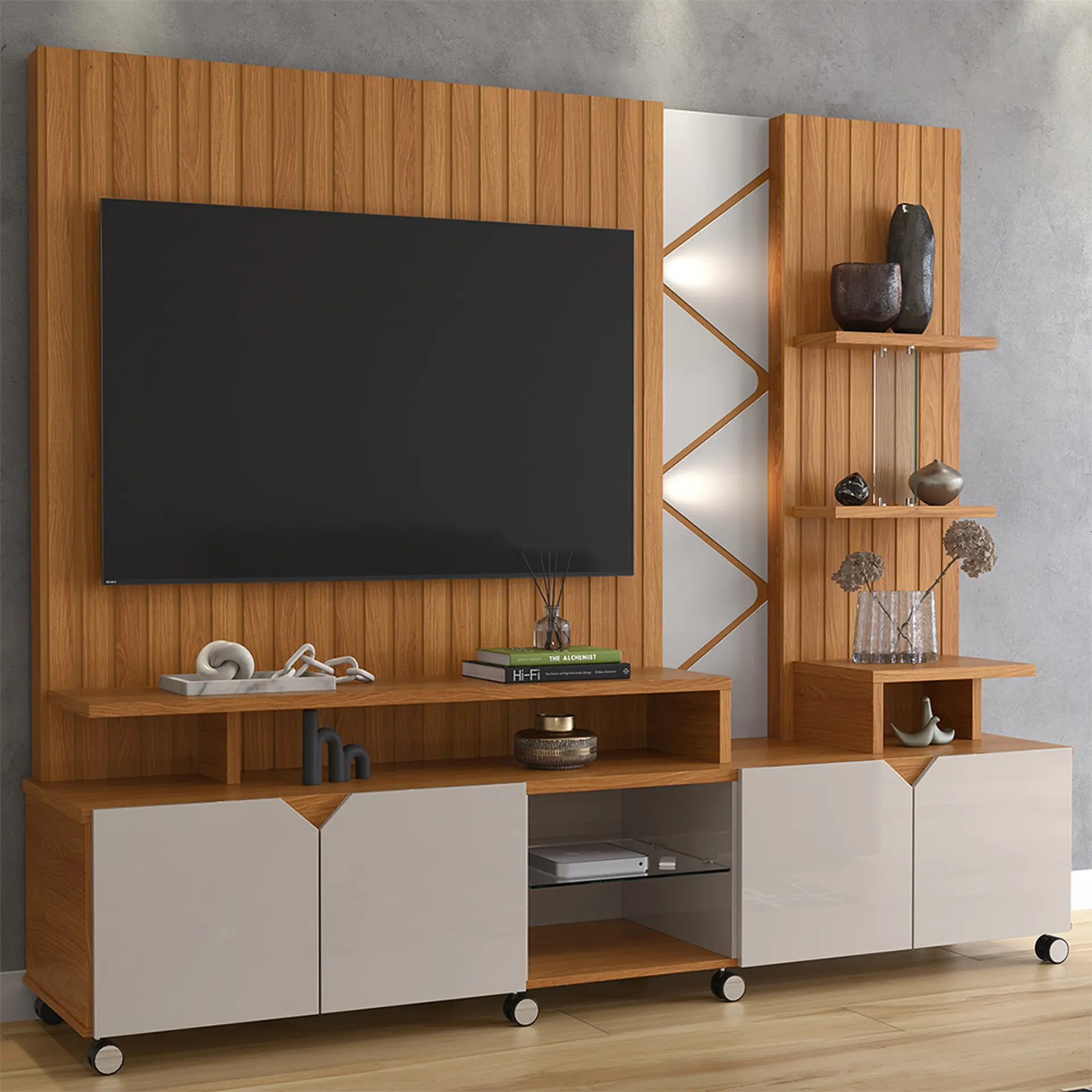 , ele possui quatro portas de bater, duas prateleiras e nichos para organizar seus aparelhos eletrônicos, seu painel suporta uma TV de até 55”. Ele vem com um acabamento de