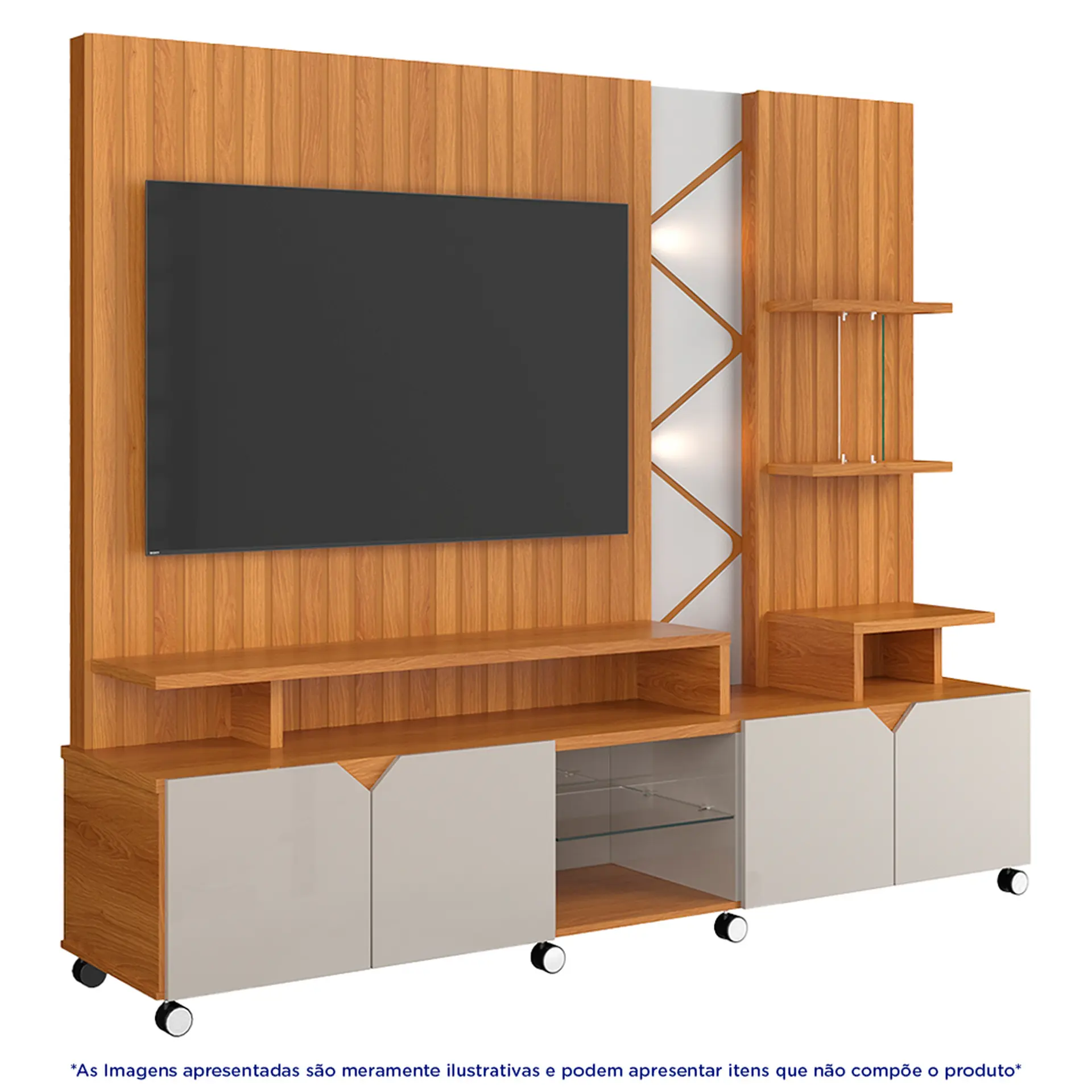 Estante Home para TV até 55″ com LED Cross Lukaliam Rodízios Cromados – Jequitibá/Off White Perolizado