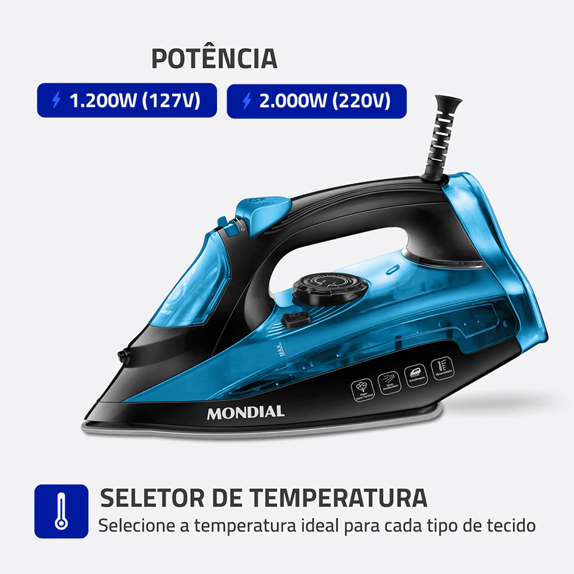 Ferro de Passar a Vapor Mondial Diamond Ceramic F-53 1200W – Preto/Azul – 110 Volts