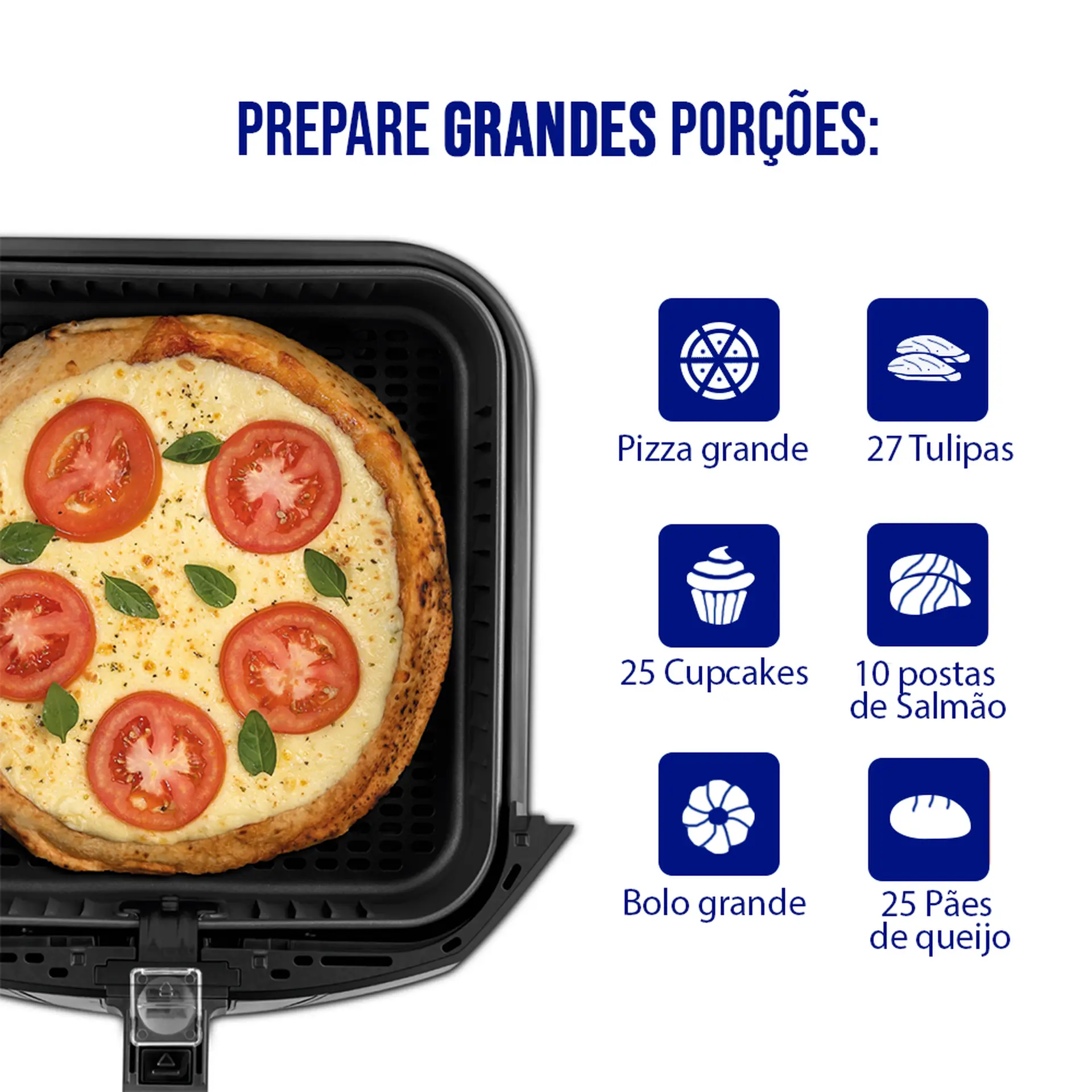te dá liberdade para criar receitas incríveis com espaço de sobra, seja um frango inteiro suculento, uma torta de 26 cm ou até 25 pães de queijo de uma vez. Mais espaço. Menos rodadas. Muito mais praticidade.