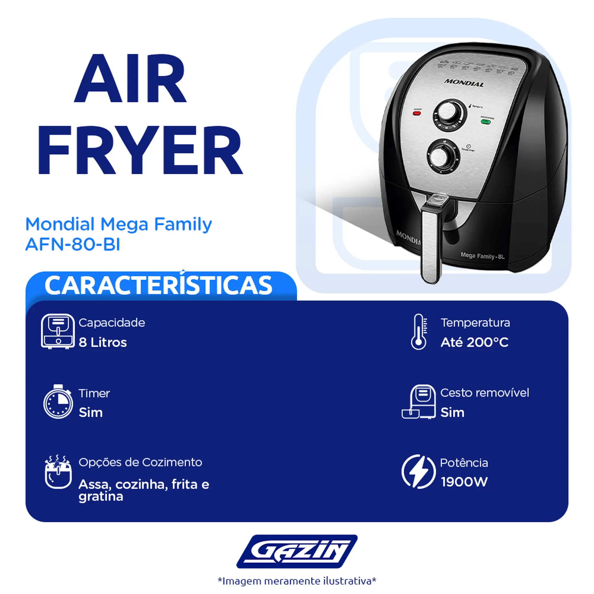 FRITADEIRA ELÉTRICA AIR FRYER MONDIAL MEGA FAMILY AFN-80-BI 8L 1900W TIMER