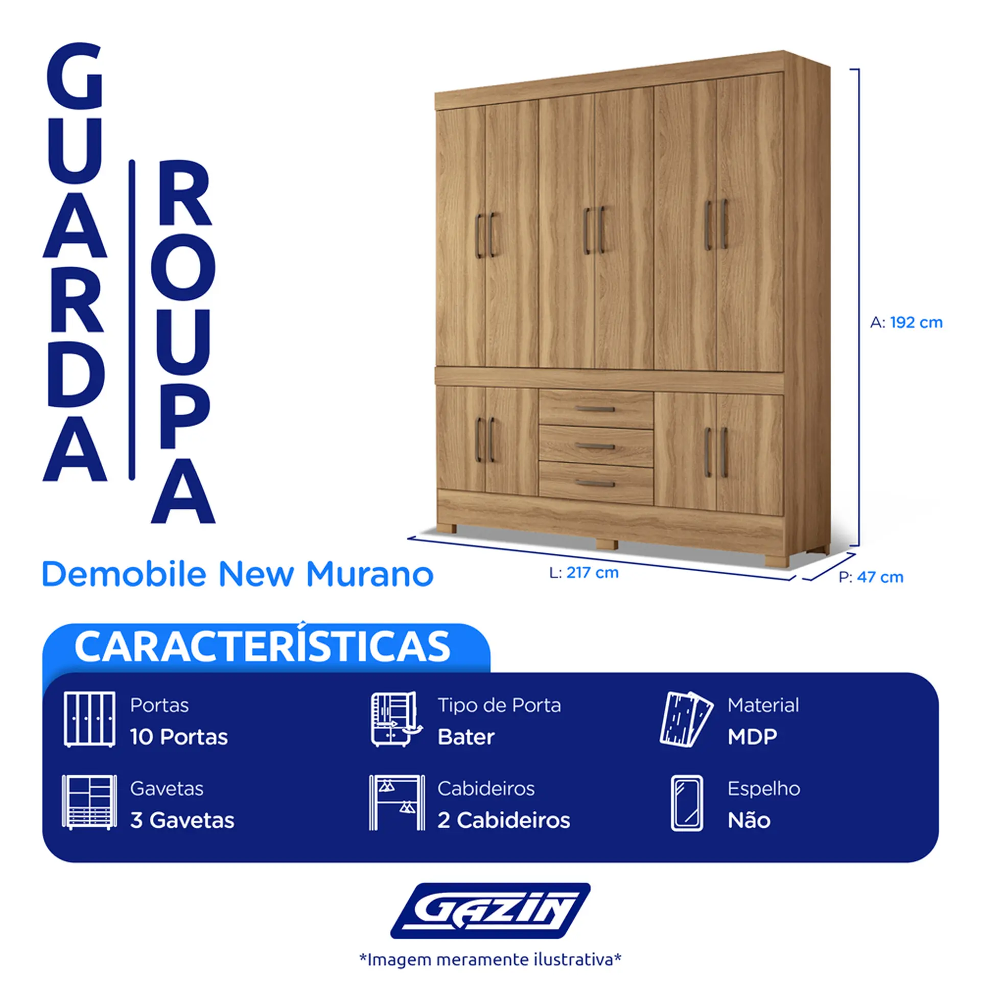 GUARDA-ROUPA CASAL 10 PORTAS BATER 3 GAVETAS NEW MURANO DEMÓBILE ROUPEIRO