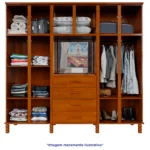 A estrutura é feita para durar. As partes externas, como portas, laterais, moldura superior, gavetas, pés e puxadores, são produzidas em madeira maciça de reflorestamento. Já o interior conta com painéis em MDP de 15mm, que imitam veios naturais de madeira, trazendo um toque aconchegante e moderno. O acabamento acetinado, com leve brilho, valoriza ainda mais qualquer ambiente.