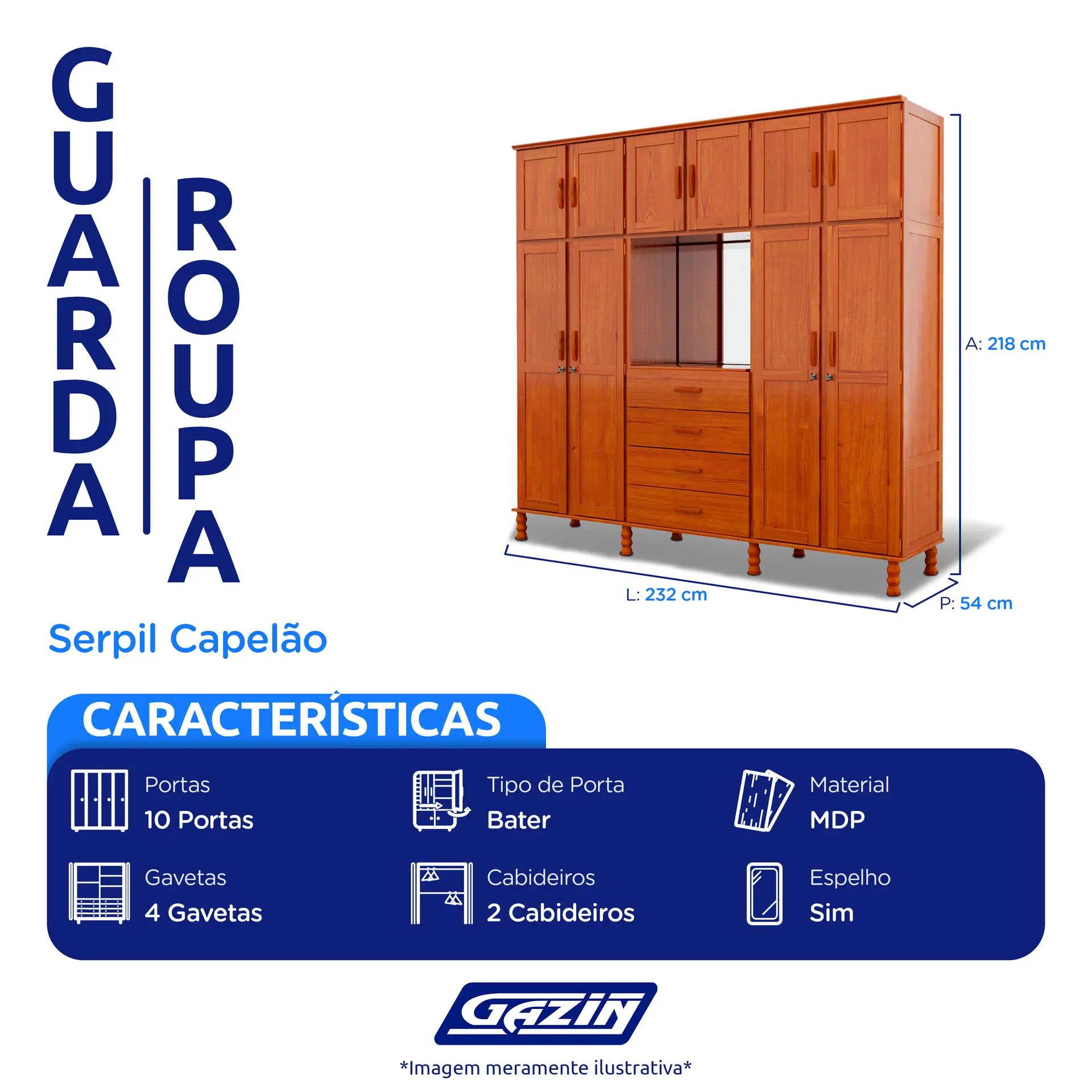 GUARDA-ROUPA CASAL 10 PORTAS BATER 4 GAVETAS SERPIL CAPELÃO