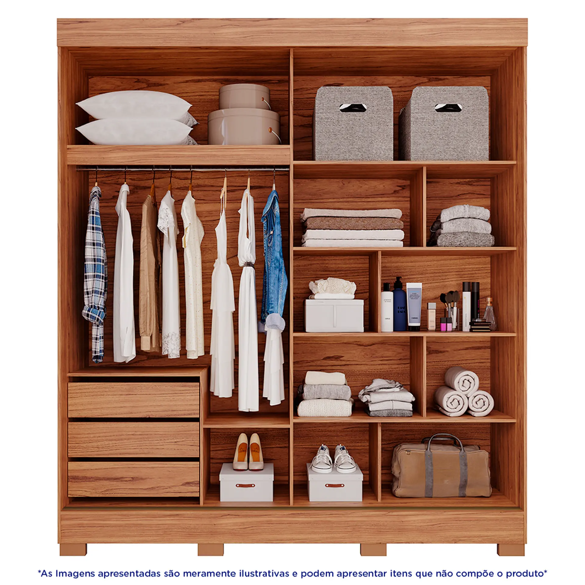 , 1 cabideiro com espaço para roupas longas e nichos divididos em vários tamanhos para acomodar suas roupas e objetos de maneira prática e segura.