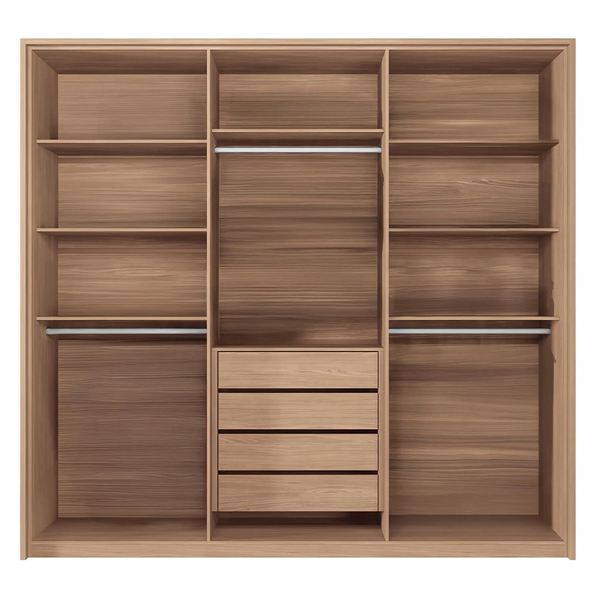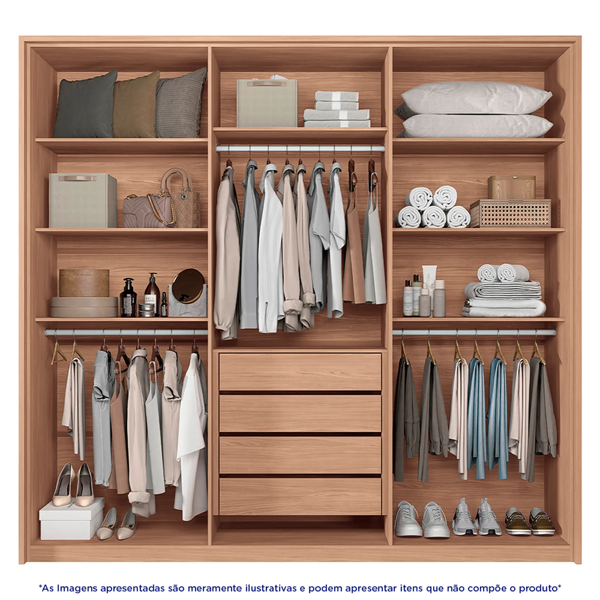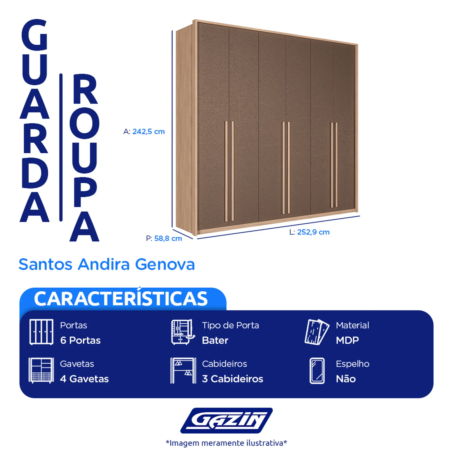 O roupeiro possui 6 portas de bater equipadas com dobradiças com amortecedores, que reduzem o barulho e prolongam a vida útil das portas. Além disso, suas 4 gavetas dispõem de corrediças telescópicas que proporcionam um deslize suave ao abrir e fechar. Os puxadores, fabricados em MDF, se destacam pelo acabamento texturizado que imita couro, e o móvel ainda conta com 3 cabideiros, ideais para quem prefere pendurar as roupas sem que elas se enverguem.
