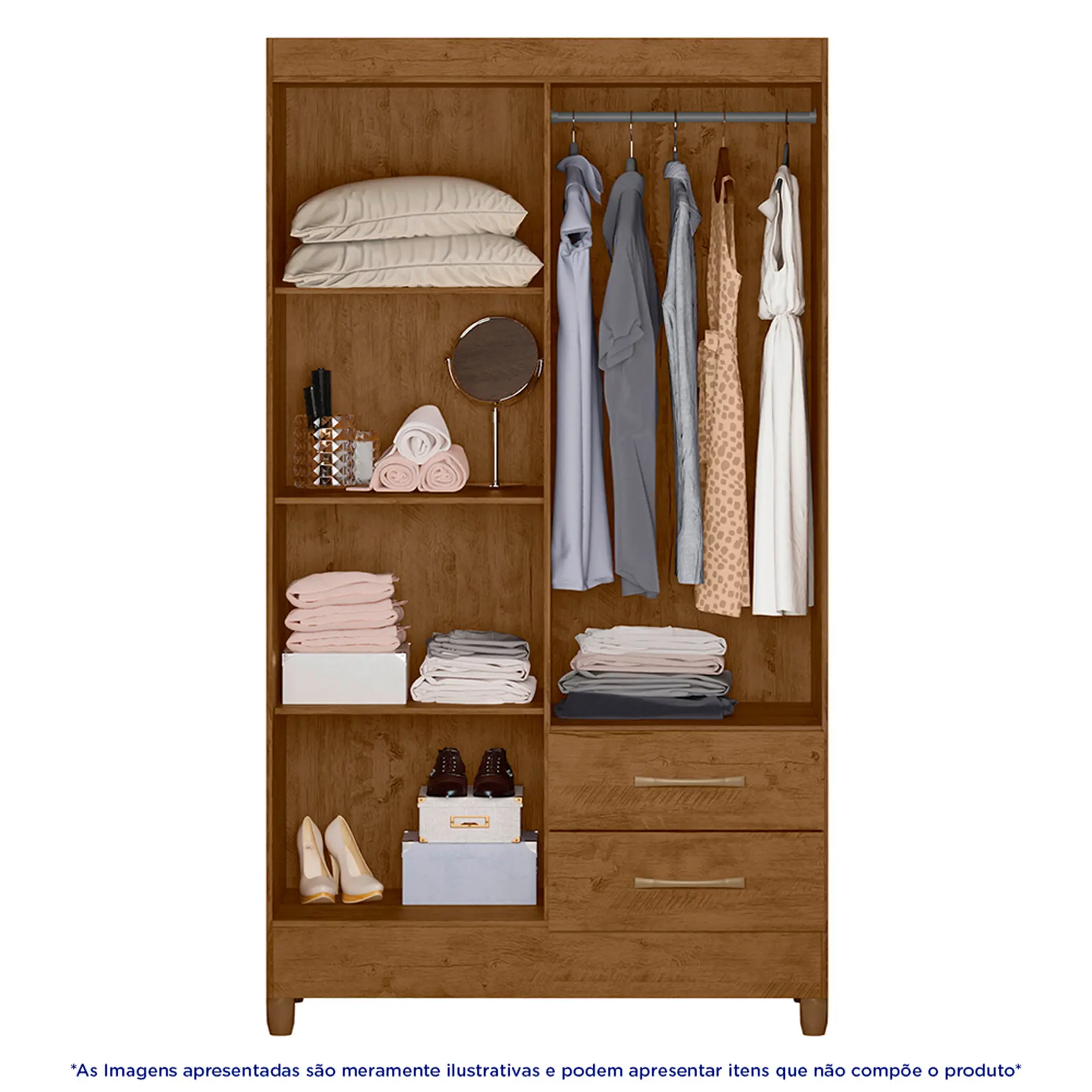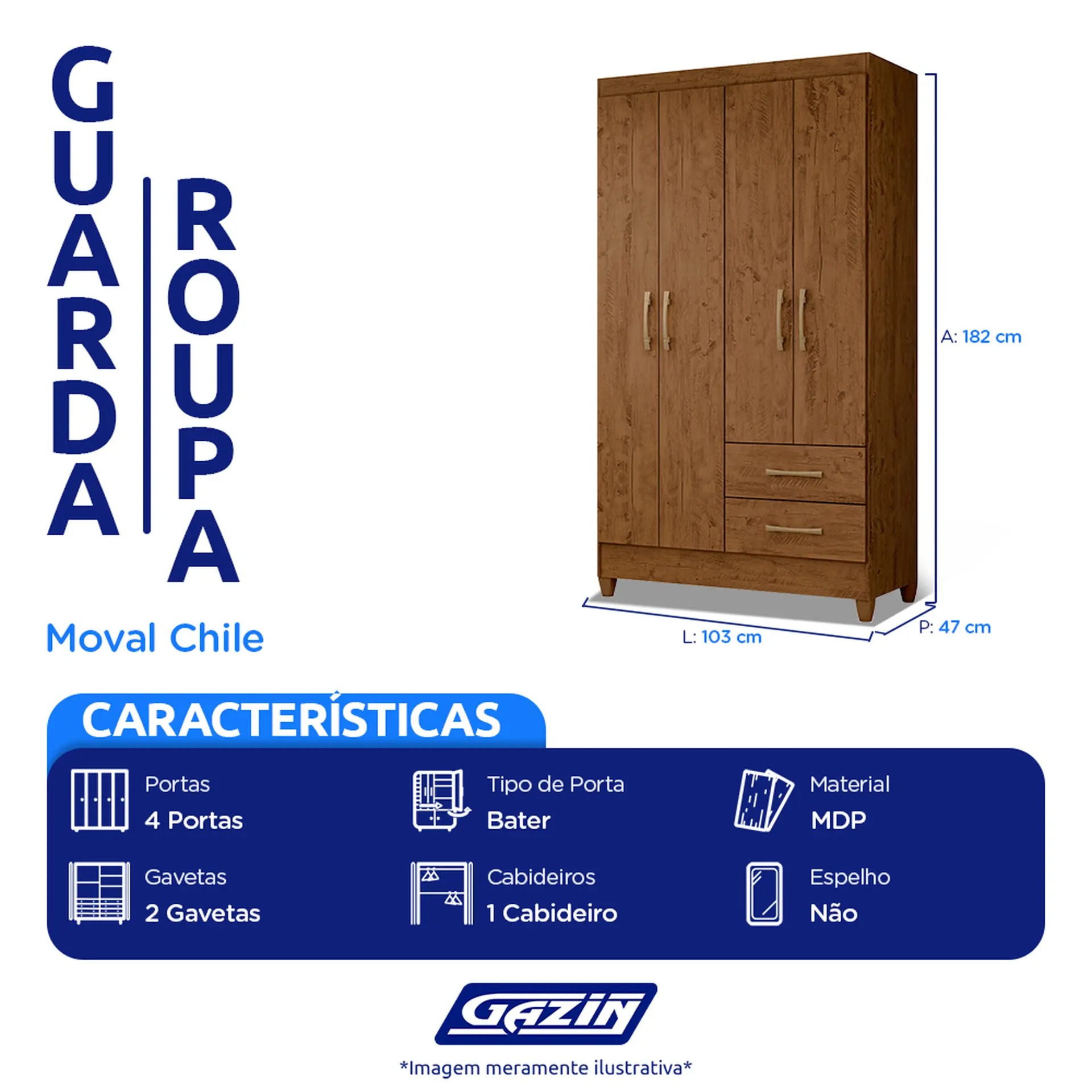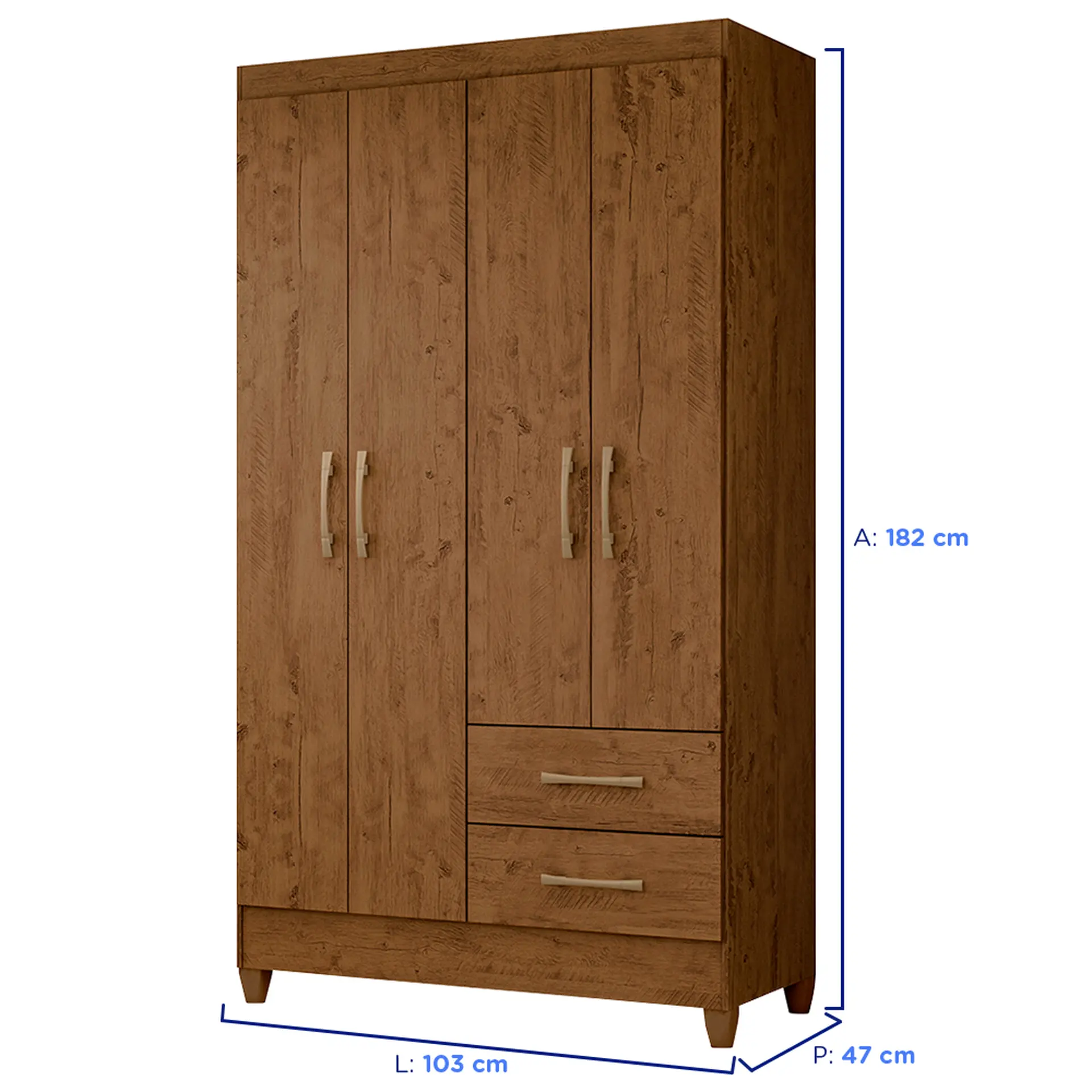 quatro portas de bater, duas gavetas com corrediças metálicas, seus puxadores tem acabamentos na cor bronze. Ele ainda possui um cabideiro e três prateleiras internas.