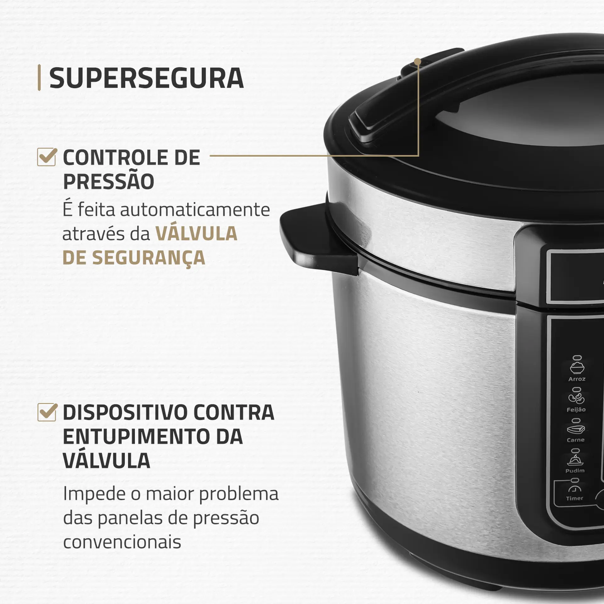 O maior problema das panelas de pressão convencional: o entupimento da válvula. Nossa panela possui um dispositivo que impede e garante total segurança.