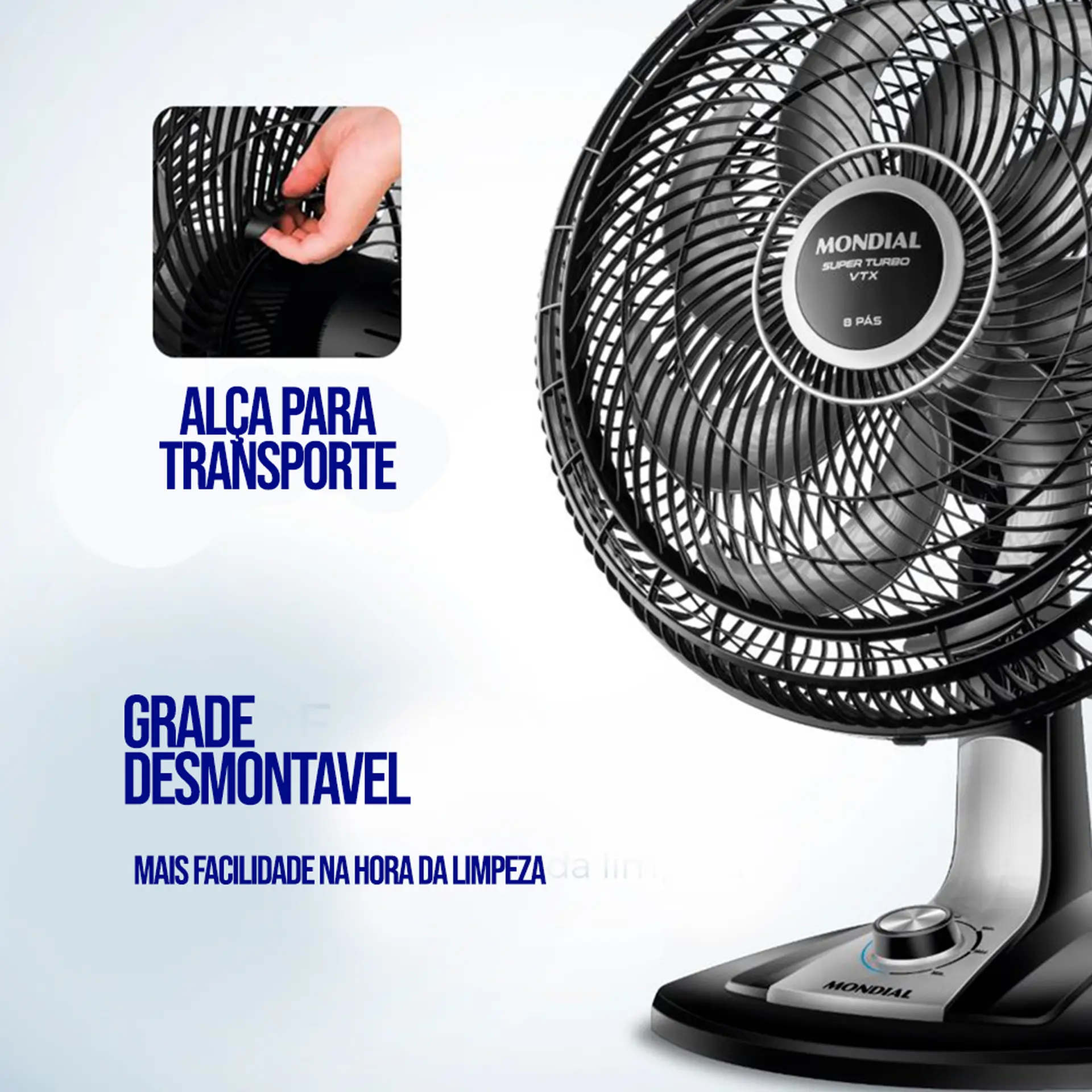 O ventilador de mesa Super Turbo VTX-40-8P possui 40 cm de diâmetro e hélice de 8 pás, o que promove uma circulação de ar mais eficiente e garante mais frescor ao ambiente. O sistema de ventilação alia a potência para refrescar ao baixo nível de ruído, proporcionando o silêncio necessário para momentos de concentração e uma excelente noite de sono. Saiba mais sobre o VTX-40-8P da Mondial:
